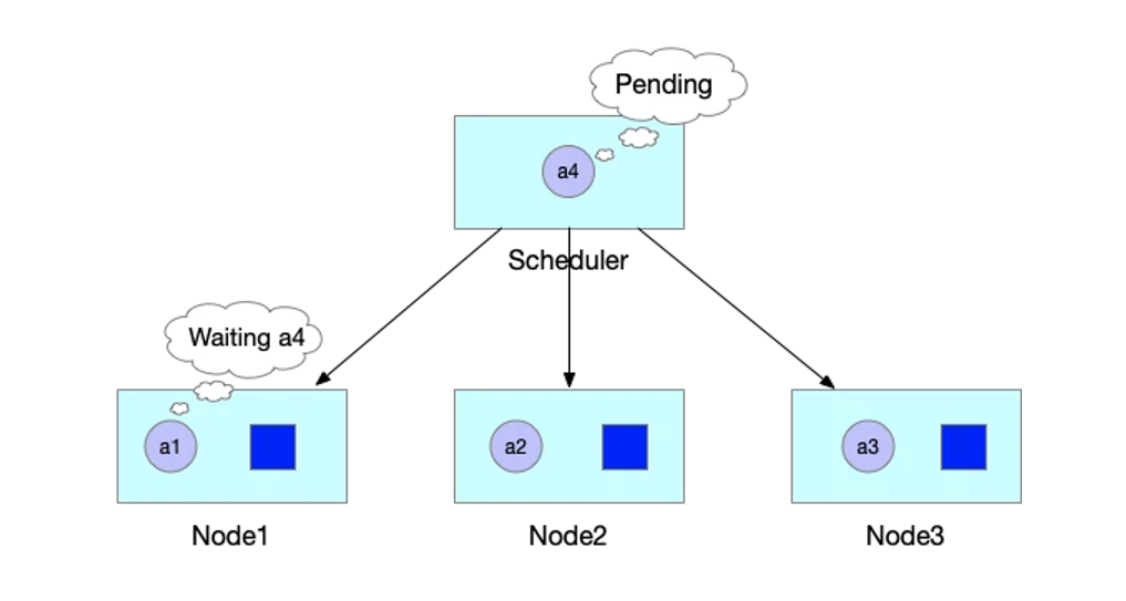 如下图所示,JobA 需要 4 个 Pod 同时启动,才能正常运行。Kube-scheduler 依次调度 3 个 Pod 并创建成功。到第 4 个 Pod 时,集群资源不足,则 JobA 的 3 个 Pod 处于空等的状态。但是它们已经占用了部分资源,如果第 4 个 Pod 不能及时启动的话,整个 JobA 无法成功运行,更糟糕的是导致集群资源浪费。