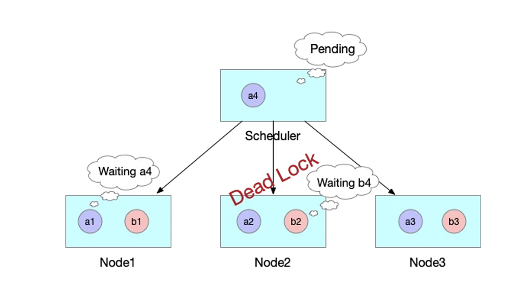 如果出现更坏的情况的话,如下图所示,集群其他的资源刚好被 JobB 的 3 个 Pod 所占用,同时在等待 JobB 的第 4 个 Pod 创建,此时整个集群就出现了死锁。