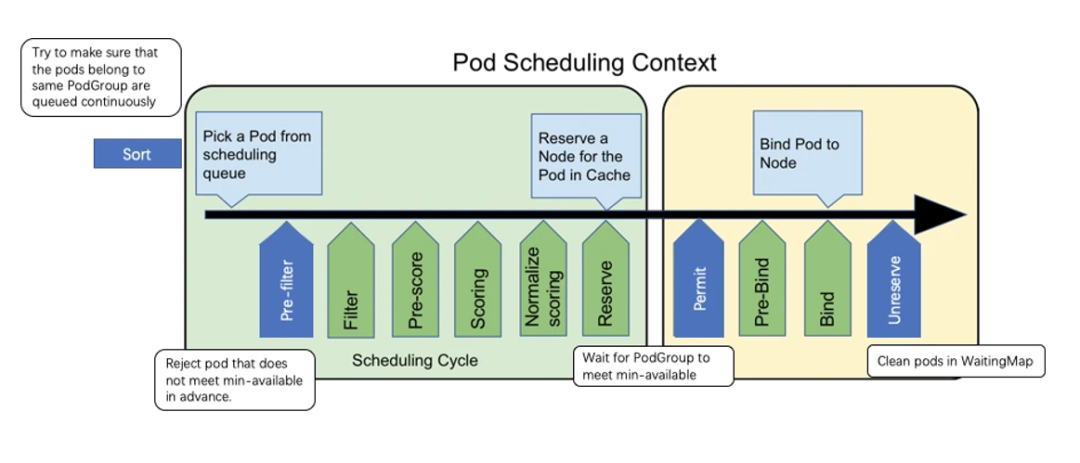 Framework 的 Permit 插件提供了延迟绑定的功能,即 Pod 进入到 Permit 阶段时,用户可以自定义条件来允许 Pod 通过、拒绝 Pod 通过以及让 Pod 等待状态(可设置超时时间)。Permit 的延迟绑定的功能,刚好可以让属于同一个 PodGruop 的 Pod 调度到这个节点时,进行等待,等待积累的 Pod 数目满足足够的数目时,再统一运行同一个 PodGruop 的所有 Pod 进行绑定并创建。