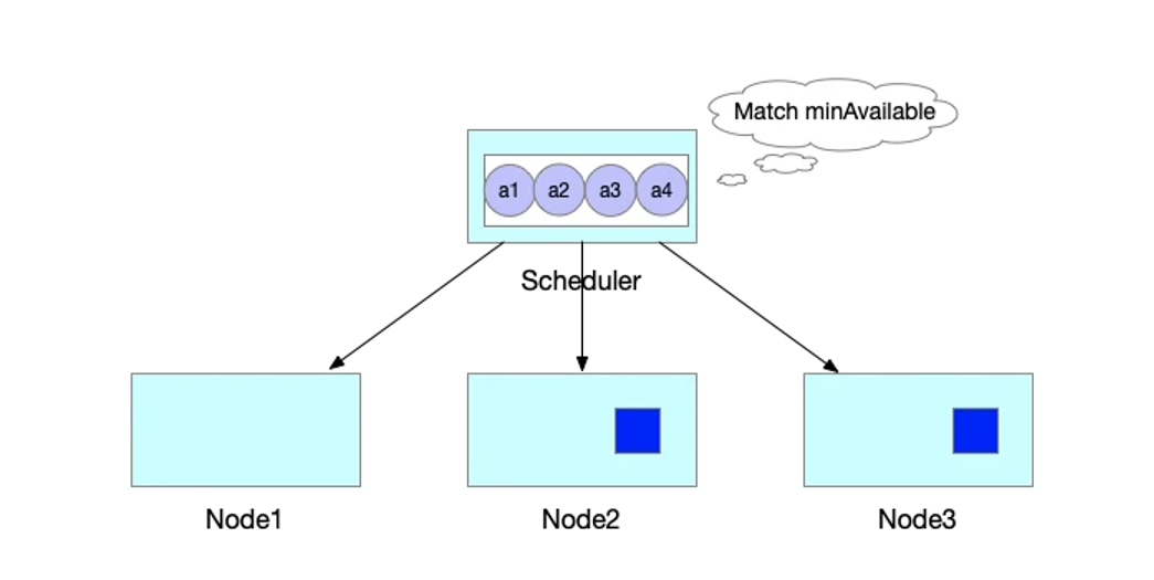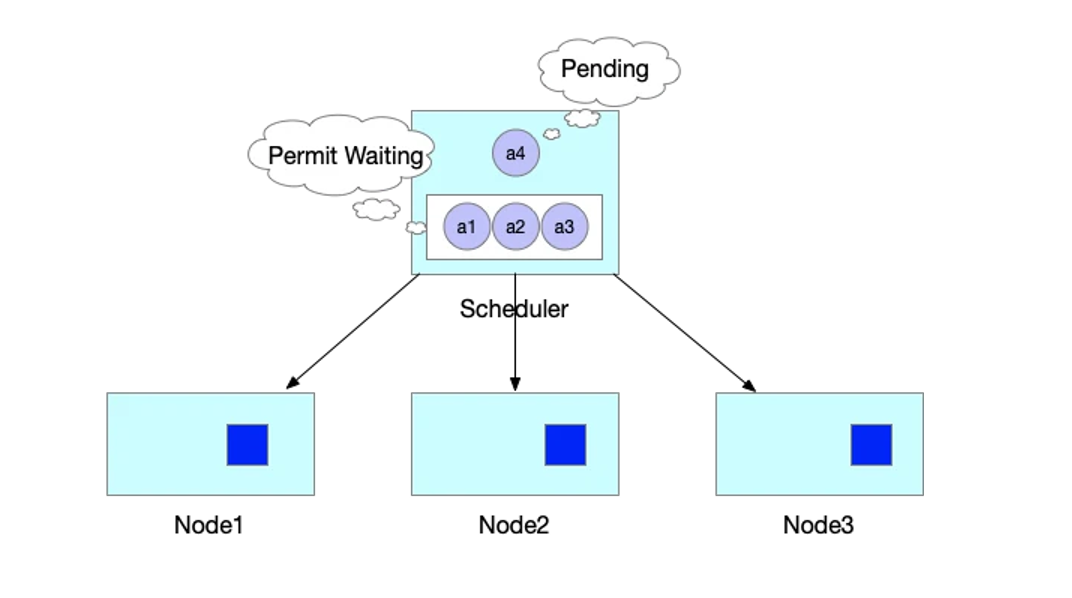 举个实际的例子,当 JobA 调度时,需要 4 个 Pod 同时启动,才能正常运行。但此时集群仅能满足 3 个 Pod 创建,此时与 Default Scheduler 不同的是,并不是直接将 3 个 Pod 调度并创建。而是通过 Framework 的 Permit 机制进行等待。