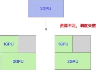 下面拿一个简单的例子来说明这种问题。如下图所示,资源在节点之间平均使用,所以每个节点使用3个GPU卡,则两个节点各剩余1GPU的资源。这是有申请2GPU的新作业,提交到调度器,则因为无法提供足够的资源,导致调度失败。