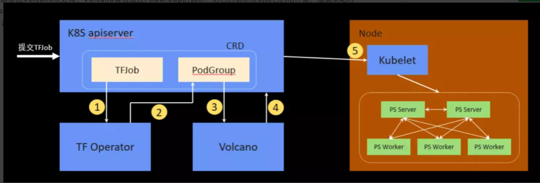 volcano scheduler调度时监控的是podGroup,podGroup相当于tfjob的抽象,等待tf-operator创建完所有pod后,会进入上面volcano scheduler的调度流程,当判断所有pod都可调度后,volcano scheduler会将所有pod调度到具体node上, 交由node上的kubelet拉起pod。