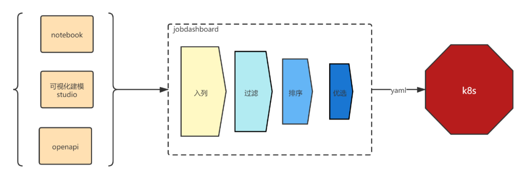 为实现训练任务批调度的目的,决定在jobdashboard增加一层缓存队列,作为对k8s调度策略的扩展,在任务下发到k8s集群上之前,先对每个请求的资源进行过滤筛选才决定要不要下发,借鉴开源实现对所有tfjob进行过滤、排序、优选, 确保足够的资源供tfjob成功运行。
