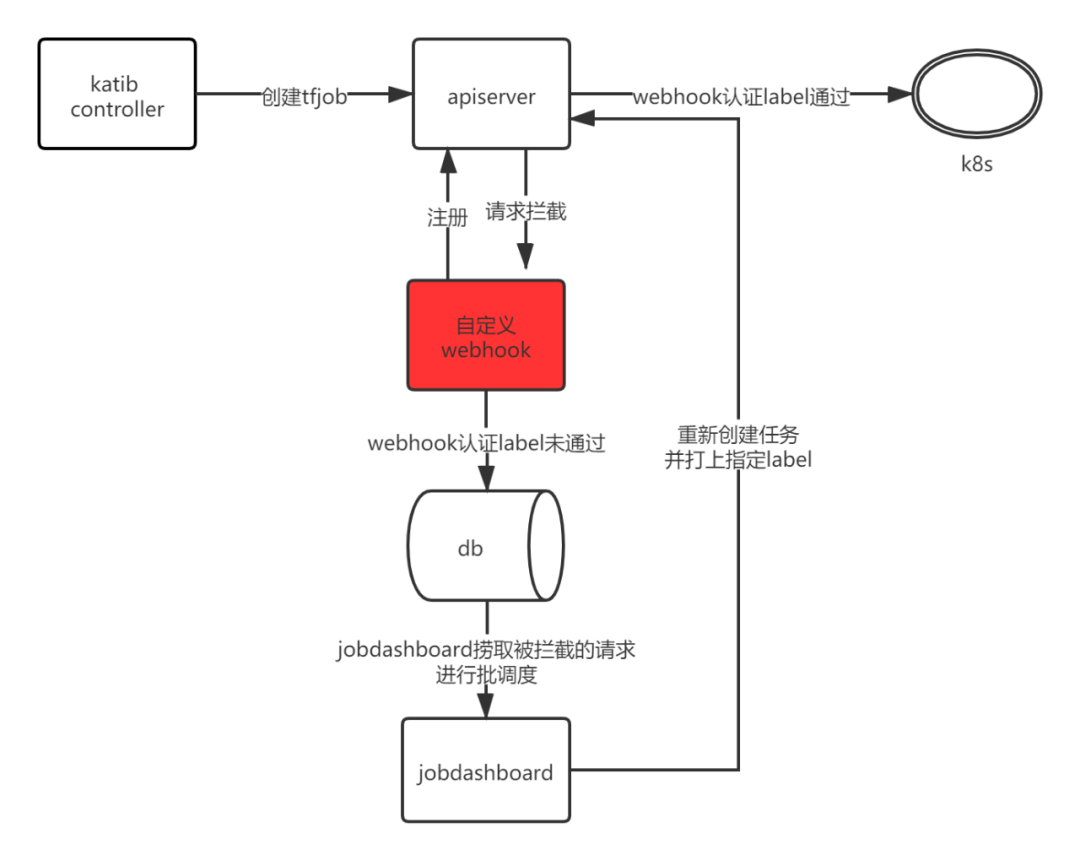 为复用上述平台已有的批调度逻辑,平台自定义一个k8s admission webhook准入控制器,拦截非平台组件jobdashboard创建tfjob的请求,转发至jobdashboard继续进行批调度逻辑。