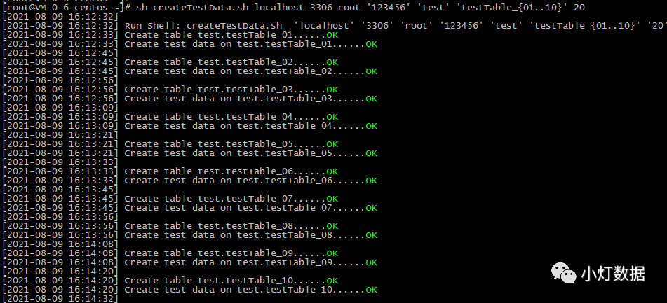 Usage2: sh createTestData.sh localhost 3306 root '123456' 'test' 'testTable_{01..10}' 20 # 在test库中生成testTable_01、testTable_02......testTable_10共10张表,每表表记录数为104万+