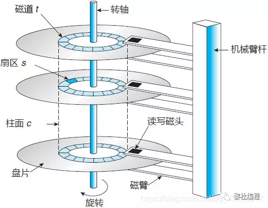 所有的盘片都固定在一条轴上,那条轴叫做盘片主轴,所有的盘片都是绝对平行的,也形成一个柱体,每个盘片上都有一个磁头,每个磁头都在同一轴线上,就是从上方往下看,磁头是绝对重叠的。