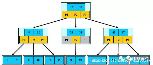 B树基于减少树的高度上,B树是一种多路搜索树,每个节点都可以有多于两个子节点,并不是二叉的:
