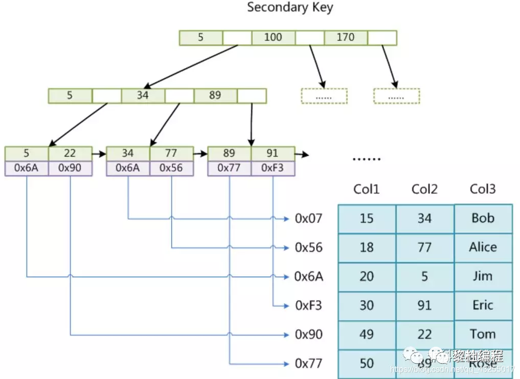 可以看出MyISAM的索引文件仅仅保存数据记录的地址。主键索引和辅助索引,只是主索引要求key是唯一的,而辅助索引的key可以重复。如果我们在Col2上建立一个辅助索引,则此索引的如下图: