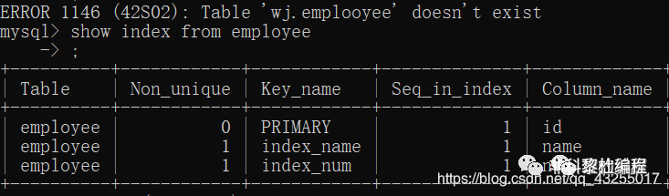 例如,查看我自己的测试表里面的索引,如下图所示,Key_name表示索引的名字,Column_name表示索引的字段: