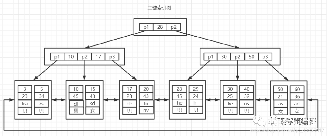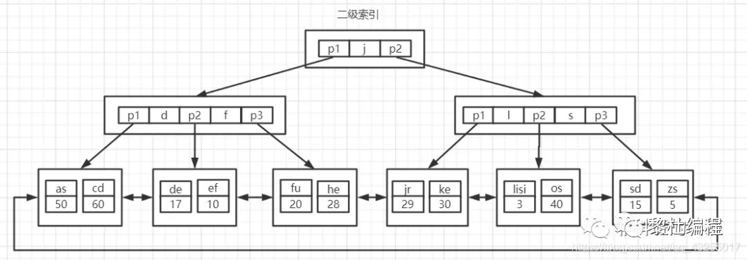 所以总结来说:B+树是多叉树,一个数据页的大小是16kb,在1-3的树高就能存储10亿级以上的数据,也就是只要访问磁盘1-3次就足够了,并且B+树的叶子结点上一个叶子结点有指针指向下一个叶子结点,便于范围查询: