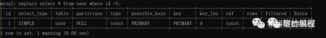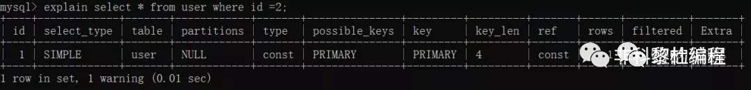 我们首先执行一条sql:explain select * from user where id =2;,执行后可以看到执行的结果如下:
