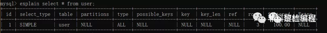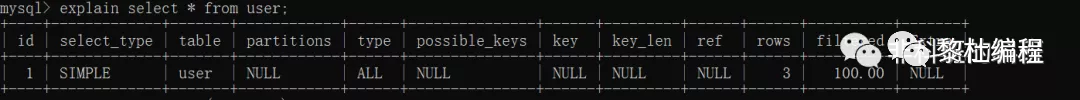 | 1 | SIMPLE | user | NULL | ALL | PRIMARY | NULL | NULL | NULL | 3 | 100.00 | NULL |