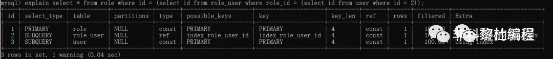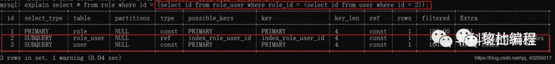 PRIMARY复杂查询中「最外层的select语句的查询类型就是PRIMARY」,例如执行下面的sql:explain select * from role where id = (select id from role_user where role_id = (select id from user where id = 2));