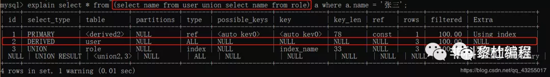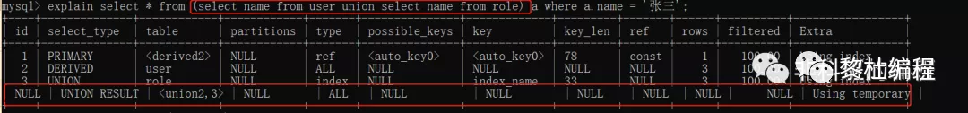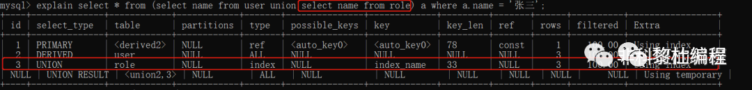 UNION RESULT「UNION查询语句的结果被标记为UNION RESULT」,如上面执行的sql:explain select * from (select name from user union select name from role) a where a.name = '张三';