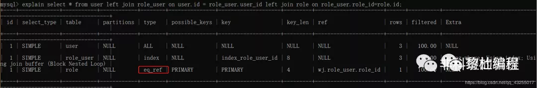 eq_ref表示使用唯一索引或者主键索引扫描作为表链接匹配条件,对于每一个索引键,表中只有一条记录与之匹配。例如:explain select * from user left join role_user on user.id = role_user.user_id left join role on role_user.role_id=role.id;