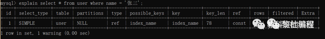 ref扫描后的结果可能会找到多条符合条件的行数据,本质上是一种索引访问,返回匹配的行。例如:explain select * from user where name = '张三';