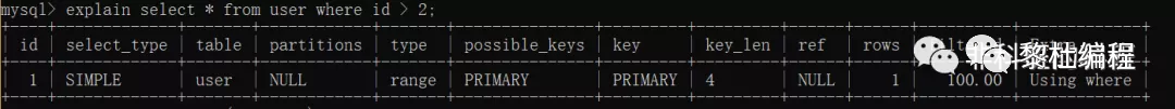 「range使用索引来检索给定范围的行数据,一般是在where后面使用between、<>、in等查询语句就会出现range」:explain select * from user where id > 2;