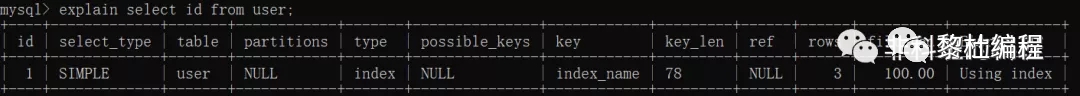表示查询的列被索引覆盖,这个是查询性能比较高的体现,即所要查询的信息搜在索引里面可以得到,不用回表,索引被正确的使用:explain select id from user where id =2;