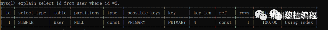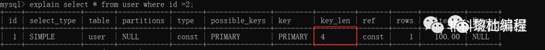 一般来说在不损失精度的前提下,key_len是越小越好,比如上面的测试表的id为int类型,int类型由4个字节组成:explain select * from user where id =2;