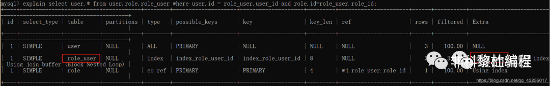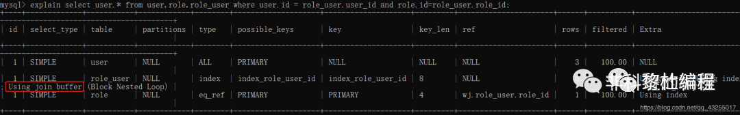 Using join buffer表示使用连接缓存:explain select user.* from user,role,role_user where user.id = role_user.user_id and role.id=role_user.role_id;