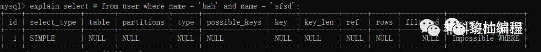 Impossible where会出现在where后的条件一直为false的情况下,这种可以忽视,比较少出现:explain select * from user where name = 'hah' and name = 'sfsd';
