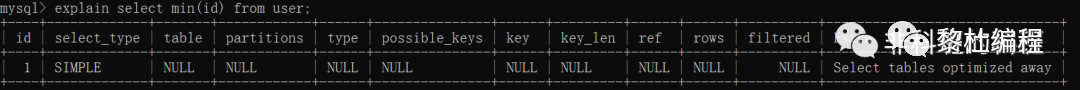 表示select语句没有遍历表或者索引就返回数据了,比如:explain select min(id) from user;