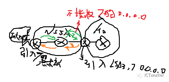 NSSA:拒绝LSA4、5,允许外部路由进入(LSA7),ABR发布一条默认路由(LSA7)