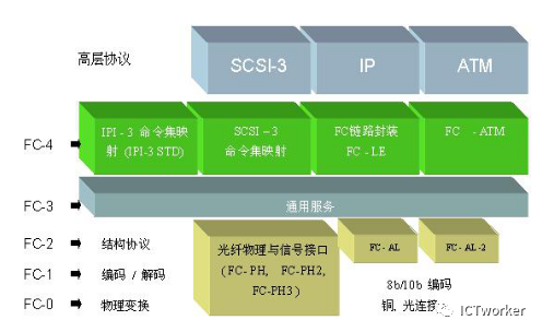 FC-4:协议映射层,定义了光纤通道和上层应用之间的接口
