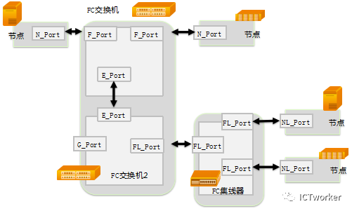 如上,当仲裁环网中出现了NL-port,那么仲裁环网中的主机就可以和光纤交换机以及外部的存储设备进行通信,在这种情况下,NL-port所连接的光纤交换机的接口就称为FL-port。
