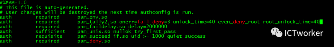 auth required pam_tally2.so onerr=fail deny=3 unlock_time=40 even_deny_root root_unlock_time=40# onerr=fail 表示当出现错误时的缺省返回值# deny 表示设置普通用户和root用户连续登陆最大错误数,超过则锁定该用户# even_deny_root 表示同时也限制root用户# unlock_time 表示普通用户锁定时间,单位是秒# root_unlock_time 表示root用户锁定时间,单位是秒