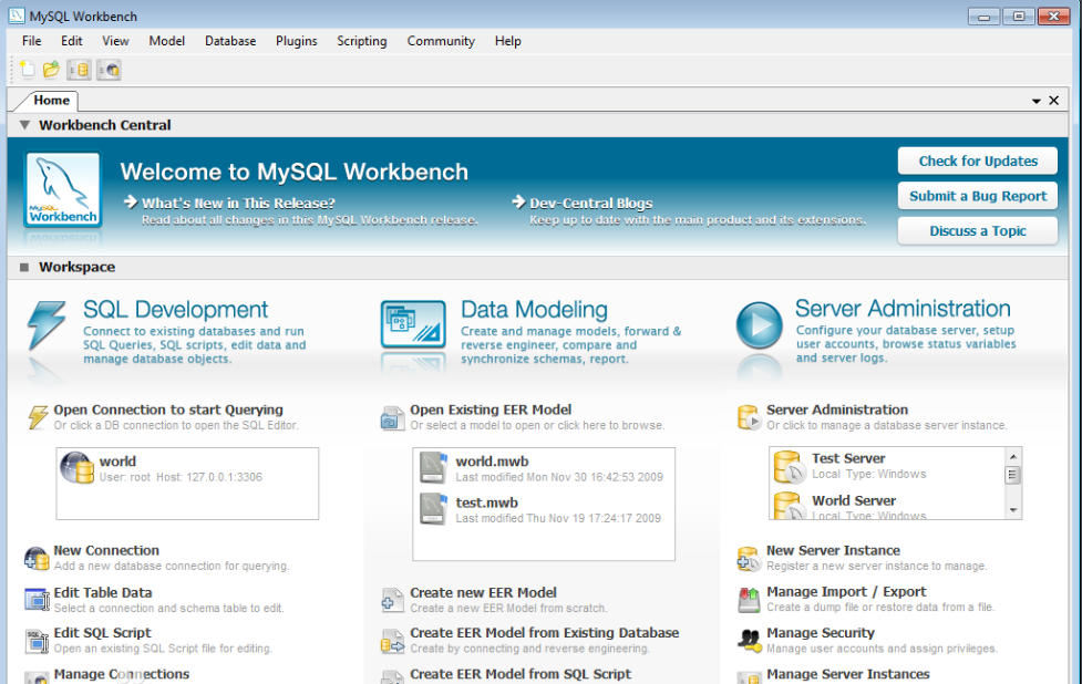 MySQL Workbench是一个统一的可视化开发和管理平台,该平台提供了许多高级工具,可支持数据库建模和设计、查询开发和测试、服务器配置和监视、用户和安全管理、备份和恢复自动化、审计数据检查以及向导驱动的数据库迁移。