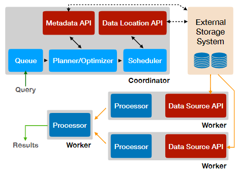 Worker节点运行这些tasks来处理从外部存储系统获取的splits,以及来自于其他Worker节点处理过得中间数据。Worker节点之间通过多任务合作机制来并发处理来自不同查询的tasks。任务尽可能的以流水线的方式来执行,这使得数据可以在tasks之间进行流动。对于某些特定的查询,Presto能够在处理完所有数据之前就返回结果。中间数据以及状态会尽可能地存储在内存中。当在节点之间对数据进行shuffle时,Presto会调整缓冲区来达到最小化的延迟。