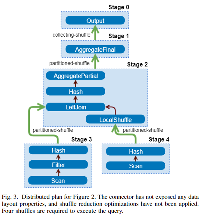 Plan node中包含了输出数据的各类信息(如分区、排序、分片及分组等数据特性),而后Plan node会在worker间并行执行Plan nodes组成的stages,stage物理上体现为多个tasks的并行执行,task就是相同的算子,只是在不同的input data上。stage间通过插入exchange算子,利用buffer来交换数据,shuffle是计算和IO密集型的,因此怎么在stages间做shuffle非常重要。图3一个执行计划,靠shuffle串联起来。