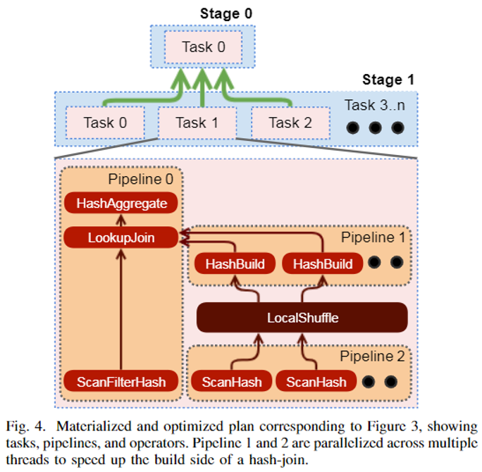一个task可以包含1到多个pipeline,pipeline包含一系列operators,例如hash-join算子包括至少两个pipeline,build table pipeline,另外一个是流式的probe pipeline。优化器如果发现一个pipeline可以支持并行优化,那么就会把一个pipeline拆开,例如build pipeline可以拆成scan data和build partitions两个pipeline,节点内并行度可以不同。pipeline直接用local shuffle串联起来。driver在Query Execution中来介绍。