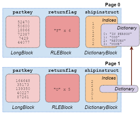 下图显示了一个page中列的布局方式,其中每一列都有其对应的编码方式。字典编码的块(DictionaryBlock)在压缩数据的低基数部分非常高效,游程编码的块(run-length encoded block,RLEBlock)对重复的数据进行压缩。多个page可以共享一个字典,这可以大大提高内存利用率。ORC文件中的一列可以为整个“stripe”(最多数百万行),使用单个字典。