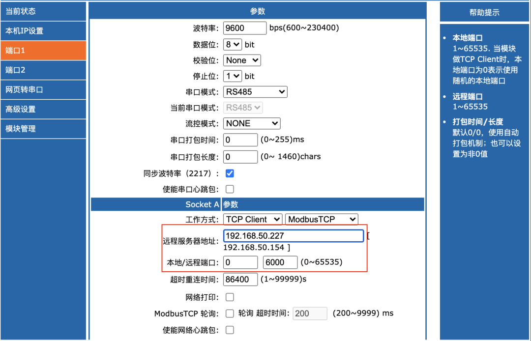 Modbus 支持连接 DTU 设备,在 DTU 设备的云端将远程服务器地址配置为 Neuron 运行所在环境的 IP 地址,配置相应的端口号,Neuron 即可访问 DTU 设备读取数据。在 Neuron 的驱动设置中,设置 Host name 时,要填写 Neuron 运行所在环境的 IP 地址。