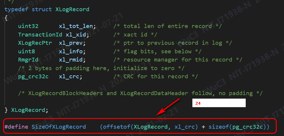 显然这里的24就是SizeOfXLogRecord,其计算方法如下: