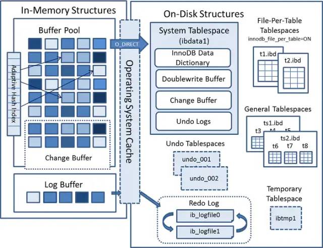 内存中的结构主要包括 Buffer Pool,Change Buffer、Adaptive Hash Index以及 Log Buffer 四部分。如果从内存上来看,Change Buffer 和 Adaptive Hash Index 占用的内存都属于 Buffer Pool,Log Buffer占用的内存与 Buffer Pool独立。