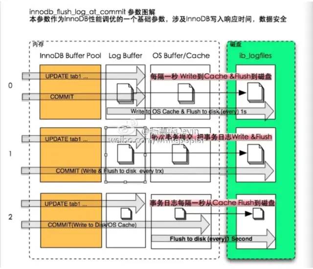 默认为1,表示每次事务提交都会将 Log Buffer 写入操作系统缓存,并调用配置的 "flush" 方法将数据写到磁盘。设置为 1 因为频繁刷磁盘效率会偏低,但是安全性高,最多丢失 1个 事务数据。而设置为 0 和 2 则可能丢失 1秒以上 的事务数据。 为 0 则表示每秒才将 Log Buffer 写入内核缓冲区并调用 "flush" 方法将数据写到磁盘。 为 2 则是每次事务提交都将 Log Buffer写入内核缓冲区,但是每秒才调用 "flush" 将内核缓冲区的数据刷到磁盘。