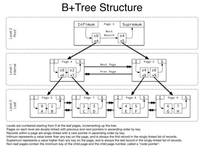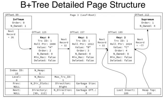 InnoDB数据文件本身就是索引文件,其索引分聚集索引和辅助索引,聚集索引的叶节点包含了完整的数据记录,辅助索引叶节点数据部分是主键的值,除了空间索引外,InnoDB的索引实现基本都是 B+ 树,如图所示。其中非叶子结点存储的是子页的最小的键值和子页的页号,叶子结点存储的是数据,数据按照索引键排序。同一层的页之间用双向链表连接(前面提到的FIL Header中PREV PAGE 和 NEXT PAGE),同一页内的记录用单向链表连接(Record Header中记录了下一条记录的偏移)。每一页设置了两个虚拟记录Infimum和Supremum用于标识页的开始和结束。