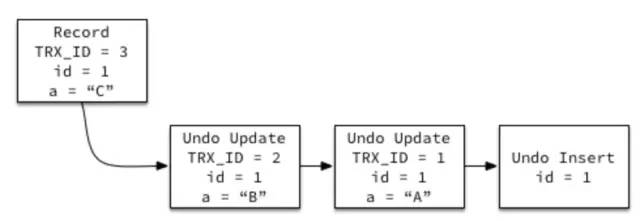 MySQL的MVCC(多版本并发控制)依赖Undo Log实现。MySQL的表空间文件 t.ibd 存储的是记录最新值,每个记录都有一个回滚指针(见前面图中的Roll Ptr),指向该记录的最近一条Undo记录,而每条Undo记录都会指向它的前一条Undo记录,如下图所示。默认情况下 undo log存储在系统表空间 ibdata1 中。