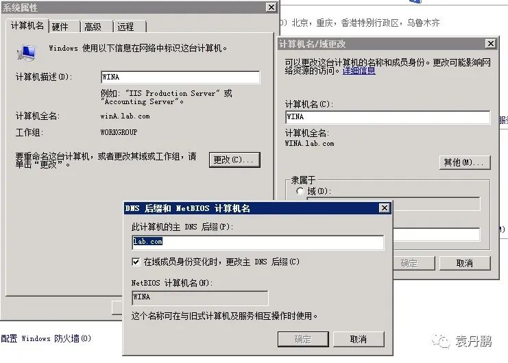 操作:右键点击桌面上的“我的电脑”图标,点击“属性”,点击右侧“更改设置“,“点击“其它”,添加主DNS后缀,需要重新启动计算机。在节点2上进行同样的操作。