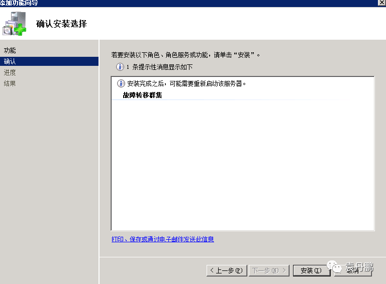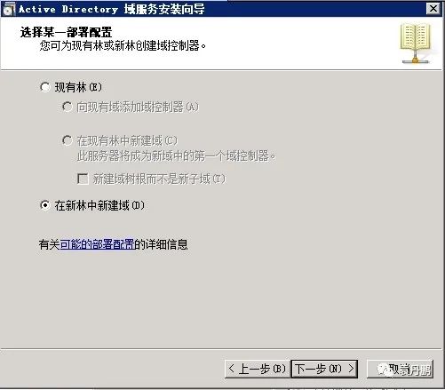 操作:由于本方案采用的是集群中的计算机均为域控制器,所以选择“在新林中新建域”,点击“下一步”继续安装