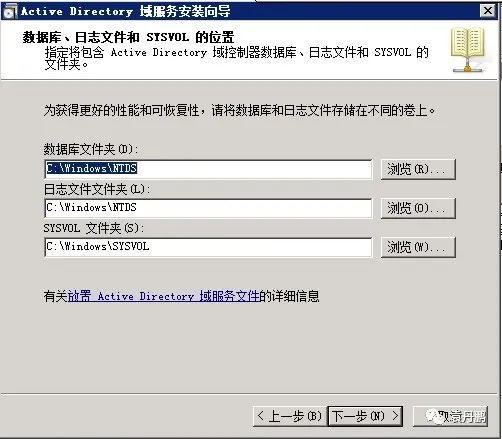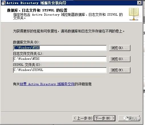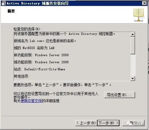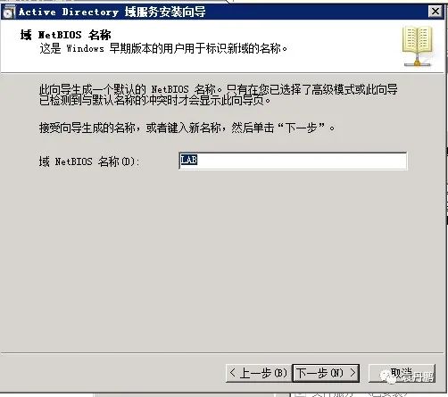 操作:接受缺省的“域NetBIOS名”,点击“下一步”继续安装