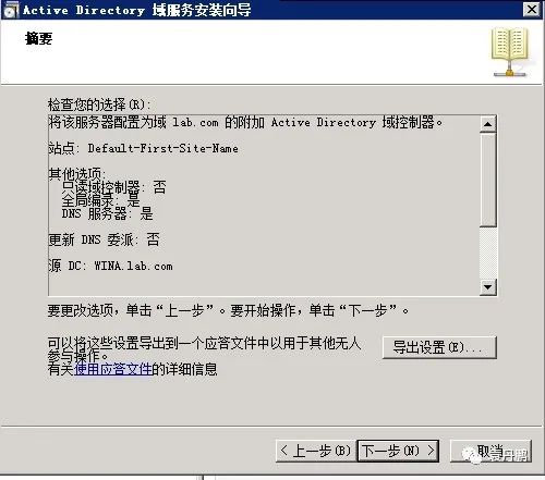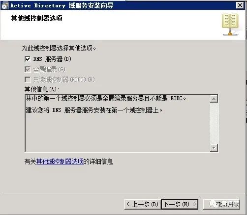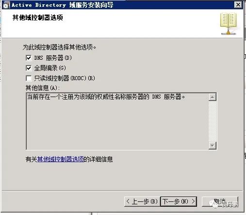 选择“DNS服务器”和“全局编录”项后单击“下一步”继续