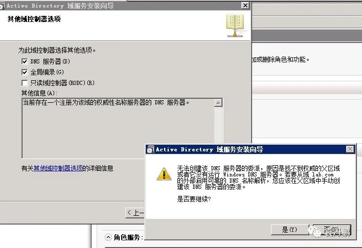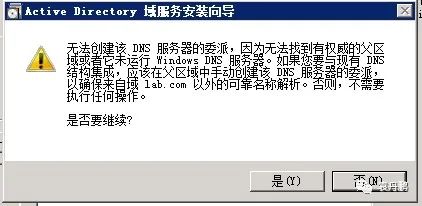 由于现在还没有DNS服务器,安装向导提出警示。点击“是”继续安装