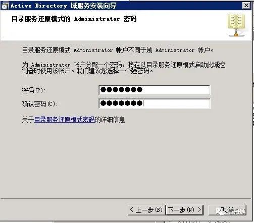 操作:输入“目录服务恢复模式”密码,点击“下一步”继续安装