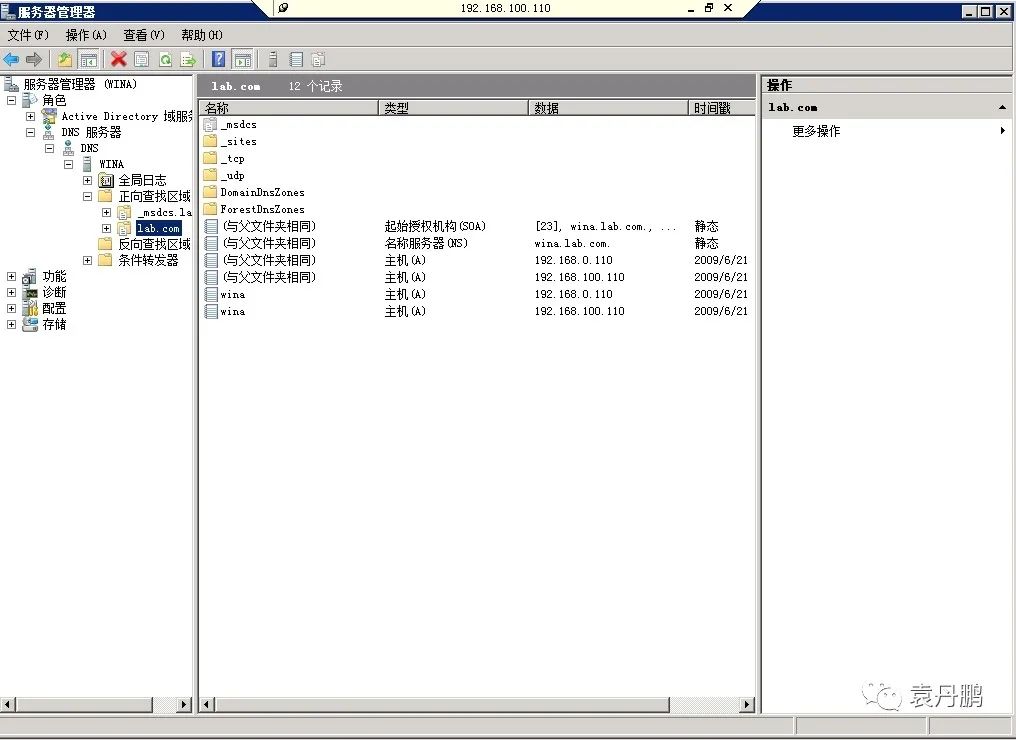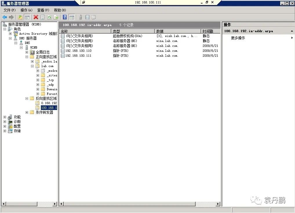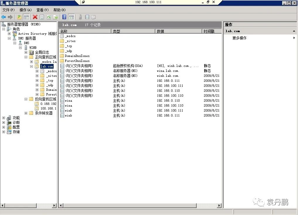 运行“管理工具”下的“DNS”管理程序,节点1安装配置“Activate Directory”和“DNS”后的DNS记录如上图所示