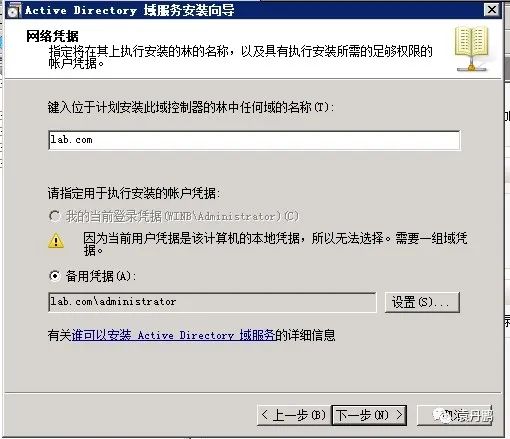 输入正确域名,选择“备用凭据”后单击“设置”,输入第一个域控的用户名密码。单击确定后如下图: