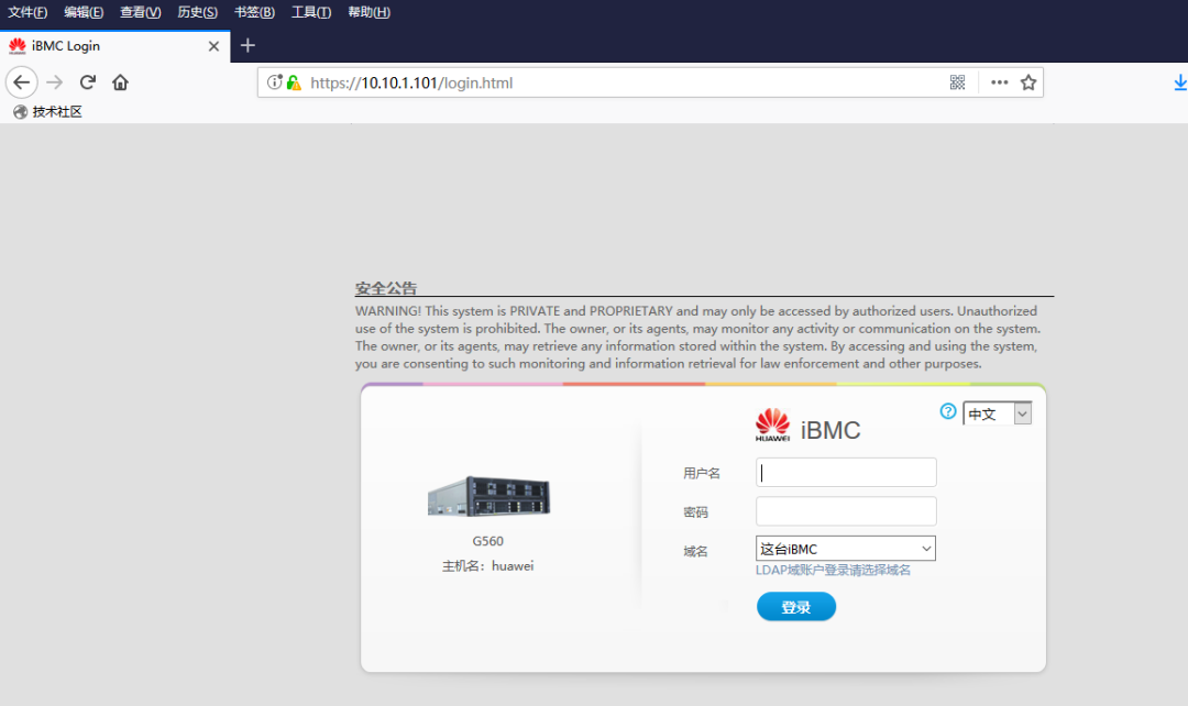 笔记本直连到华为iBMC远程控制端口,设置为同网段,网页打开10.10.1.101(实际管理地址)